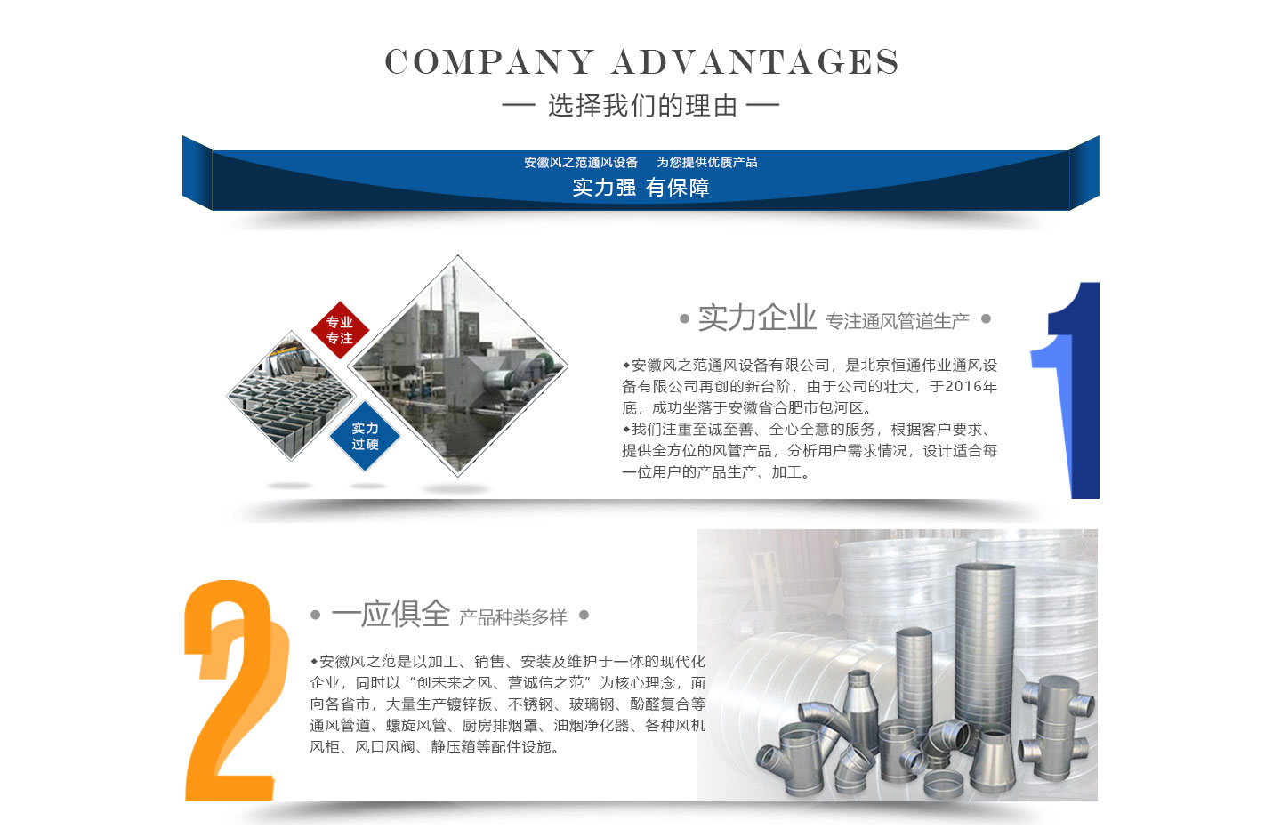 安徽風(fēng)之范通風(fēng)設(shè)備有限公司,是北京恒通偉業(yè)通風(fēng)設(shè)備有限公司再創(chuàng)的新臺階,多年來,公司員工憑著“誠信敬業(yè)、團結(jié)拼搏、勇于開拓、務(wù)實進取”的企業(yè)精神,先后承接了多項重點工程項目,使公司健康穩(wěn)步發(fā)展。現(xiàn)由于公司的壯大,業(yè)務(wù)的拓展,又于2016年底,成功坐落于安徽省合肥市包河區(qū)。本公司生產(chǎn)設(shè)備精良,技術(shù)力量雄厚,質(zhì)保體系完善!讓用戶體驗到,貼心的服務(wù),無憂的售后!風(fēng)之范是以加工、銷售、安裝及維護于一體的現(xiàn)代化企業(yè),同時以“創(chuàng)未來之風(fēng)、營誠信之范”為核心理念,面向全國各省市,大量生產(chǎn)鍍鋅板、不銹鋼、玻璃鋼、酚醛復(fù)合等通風(fēng)管道、螺旋風(fēng)管、廚房排煙罩、油煙凈化器、各種風(fēng)機風(fēng)柜、風(fēng)口風(fēng)閥、靜壓箱等配件設(shè)施。廣泛承接商場、工廠、酒店、寫字樓、地下室等,消防排煙工程、除塵凈化工程、室內(nèi)通風(fēng)工程、暖通空調(diào)工程、廚房排煙凈化工程。我們力求上進,追求,歡迎各界人士技術(shù)指導(dǎo),經(jīng)濟合作,共創(chuàng)美好明天!